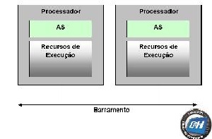 Na Figura 1 vemos o diagrama de dois processadores. Em nosso diagrama, os registradores e controlador de interrupção foram chamados de “AS“. Na área denominada de “recursos de execução” estão todos os recursos que o processador necessita para executar as instruções. O processador da esquerda não suporta a tecnologia Hyper-Threading. O processador da direita suporta, duplicando seus registradores e controladores e compartilhado os recursos de execução entre os processadores lógicos, parecendo assim um sistema com dois processadores.