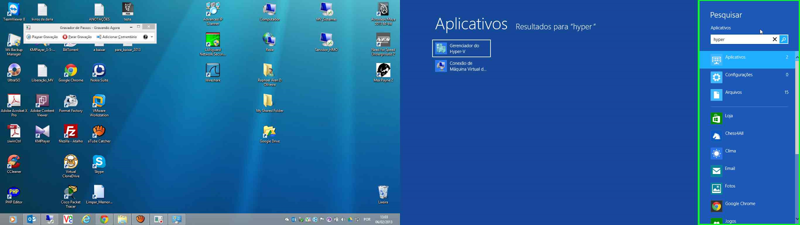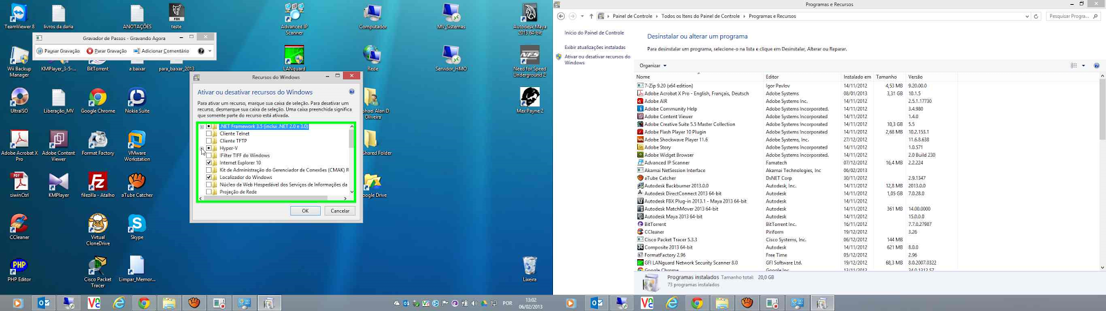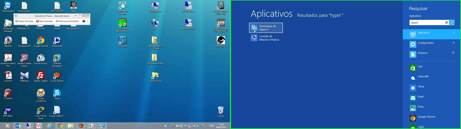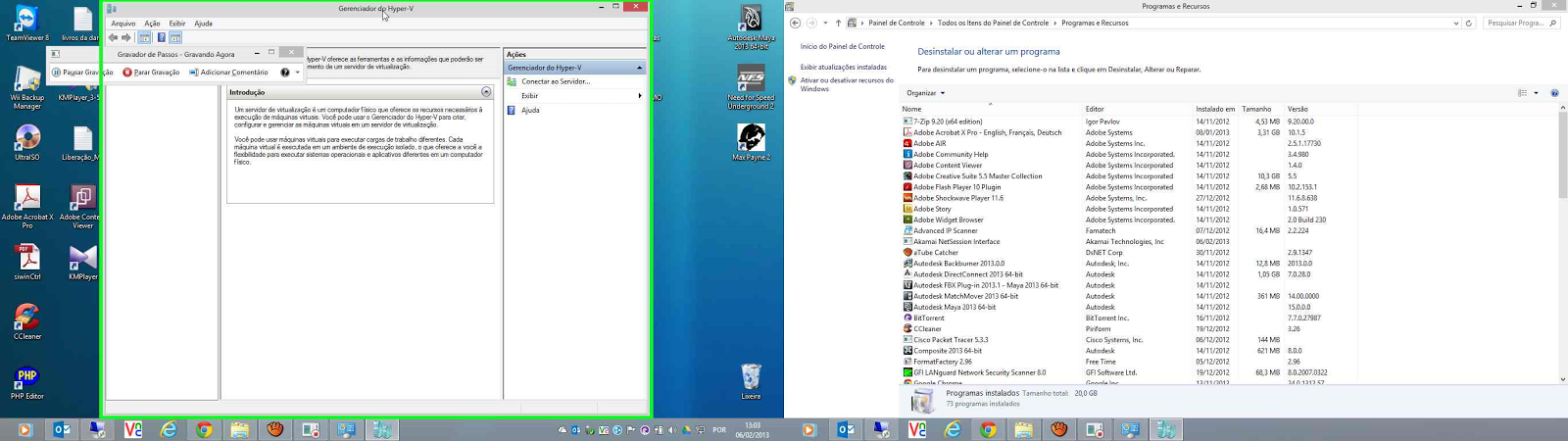 Usarei esse passo por passo, para mostrar como ativar a ferramente Hyper-V para sistemas Windows 8, pode emular Imagens em VHD e testa-las, e o bom nem pesa na maquina, ele é executado como serviço, o procedimento é simples, siga o tutorial.